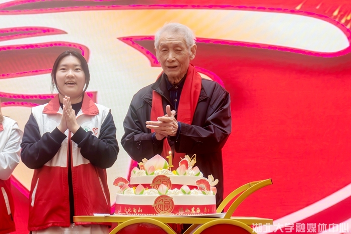 70岁寿星代表王扬、蔚蓝朗诵诗歌《老有老的骄傲》,以“人生就像一坛酒,越老越有味道”表达对晚年生活的从容与自豪。80岁寿星代表田子渝深情回顾自己与湖大共同成长的岁月。尽管退休多年,他仍坚持党史研究,指导青年学者,并热爱烹饪,展现了老一辈学者乐观积极的生活态度。90岁寿星代表万家佩上台分切生日蛋糕,全场齐唱《生日快乐》歌,将温馨气氛推向高潮。