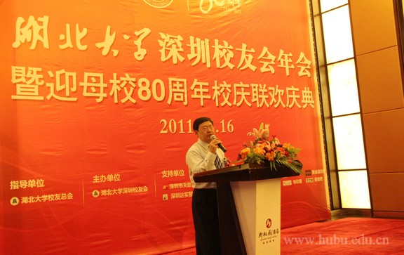 芳菲四月,鹏城风和。16日下午,湖北大学深圳校友会2011年年会暨迎母校80周年校庆联欢庆典在深圳市南山中心区海岸城新桃园酒店盛大开幕。湖北大学深圳校友会理事会全体成员出席了会议,知名红树林研究专家、深圳市第四届政协委员王勇军,深圳实验学校校长、首届“鹏城杰出人才奖”获得者曹衍清,深圳市飞优特科技有限公司董事长肖仁亮,深圳市统计局局长殷勇,深圳市坪山新区党工委书记杨绪松,深圳巨浪科技有限公司董事长吴哲清,深圳市合腾兴实业有限公司董事长田红兵等500余名校友参会。湖北大学官方微博全程直播了此次年会。